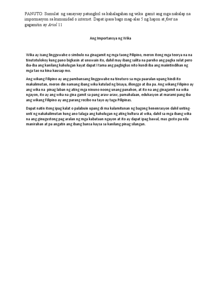 Sanaysay tungkol sa Wikang Katutubodocx - Pangalan Luke Kim Emmanuel B Dusaran Baitang X u2013 SJP II Wika Natin Wikang katutubo ano nga ba ito Ito ba. Isang replektibong sanaysay tungkol sa Kapangyarihan ng Wika Ang wika ng kapangyarihan ni Conrado de Quiros. Ngunit hindi lamang iyan ang kayang ipagmalaki ng ating bansa sapagkat kayang-kaya rin nating ipagmalaki ang mayaman at makulay nating kultura.