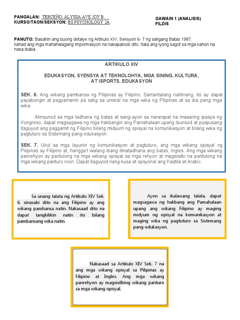 Kung kaya lumawak ang paggamit nito sa wika ng pagkatuto at mas mapapaangat pa ang antas ng literasi sa edukasyong Pilipino. Artikulo 14 Seksyon 6 ng 1987 Konstitusyon - CORAZON AQUINO Ang Wikang Pambansa ng Pilipinas ay Filipino samantalang nililinang ito ay dapat na payabungin at pagyamanin pa salig sa umiiral na mga wika sa Pilipinas at sa iba pang mga wika. Ano ang Artikulo XIV seksyon 6 ng 1987 konstitusyon.